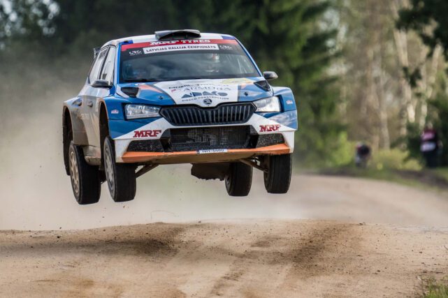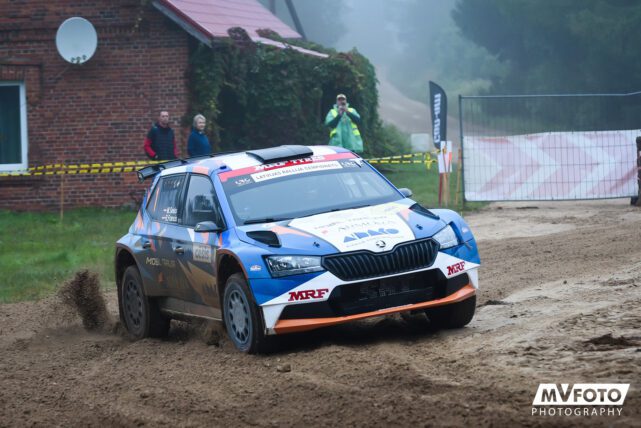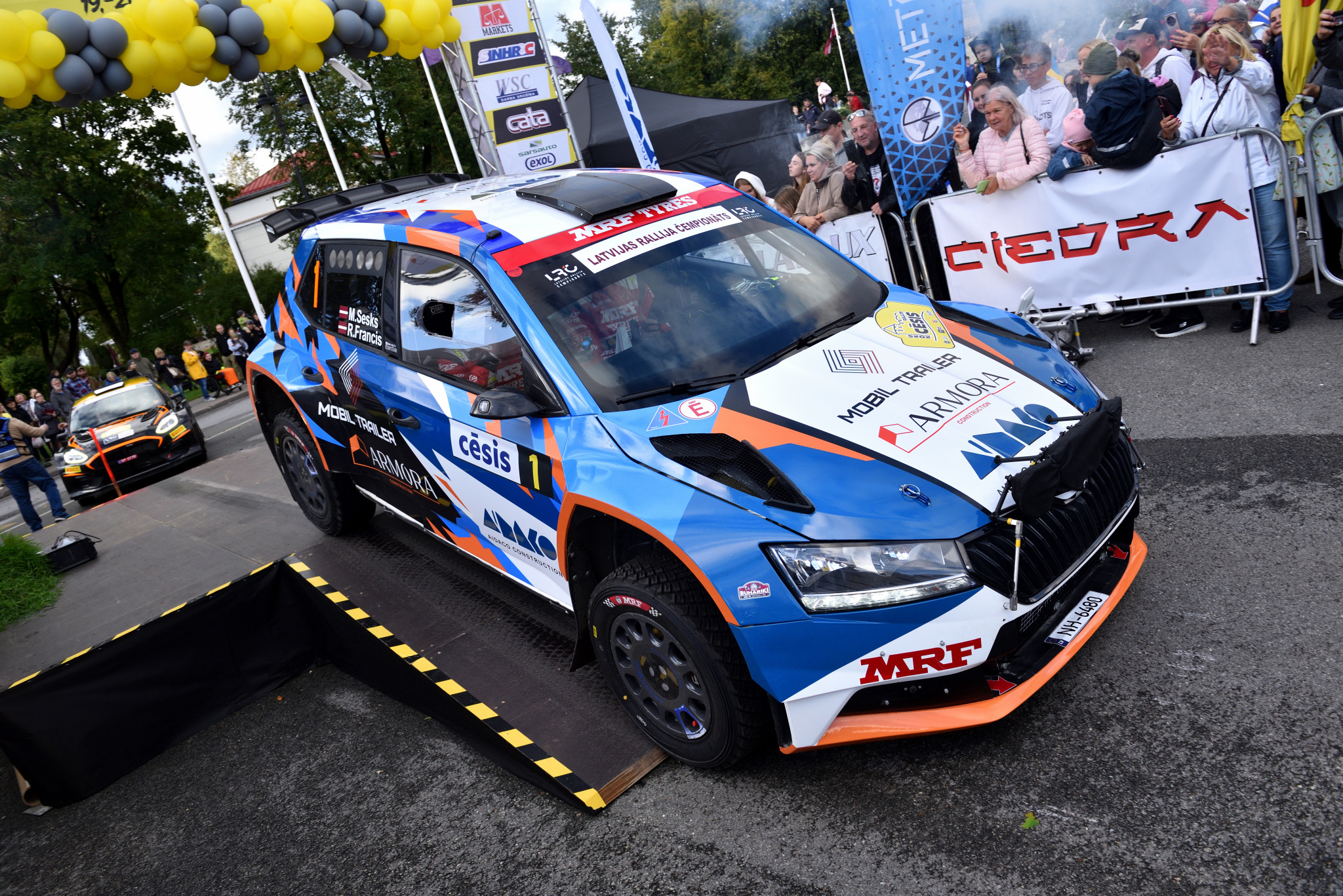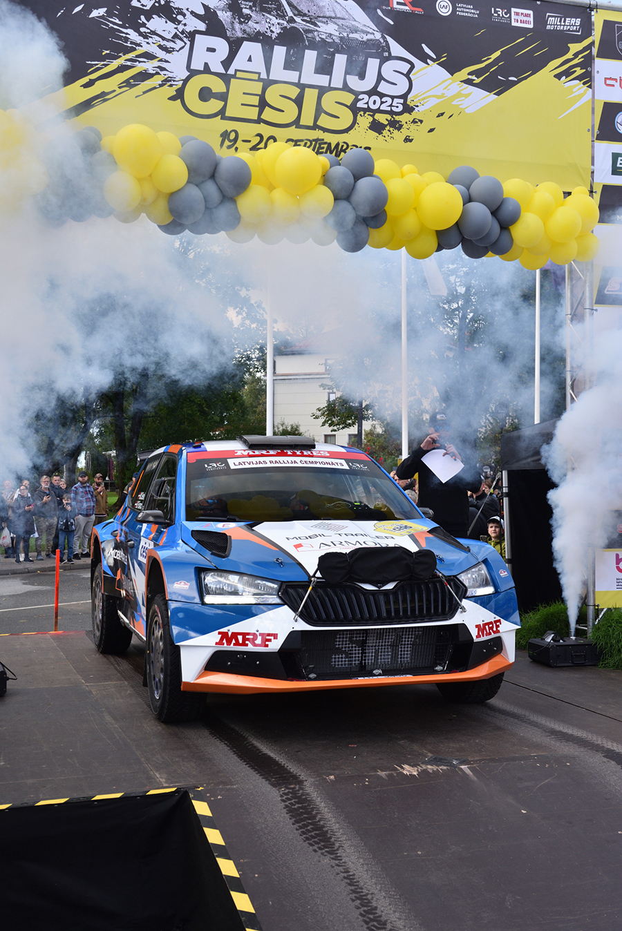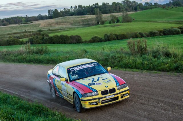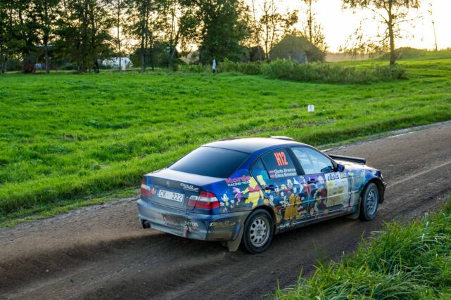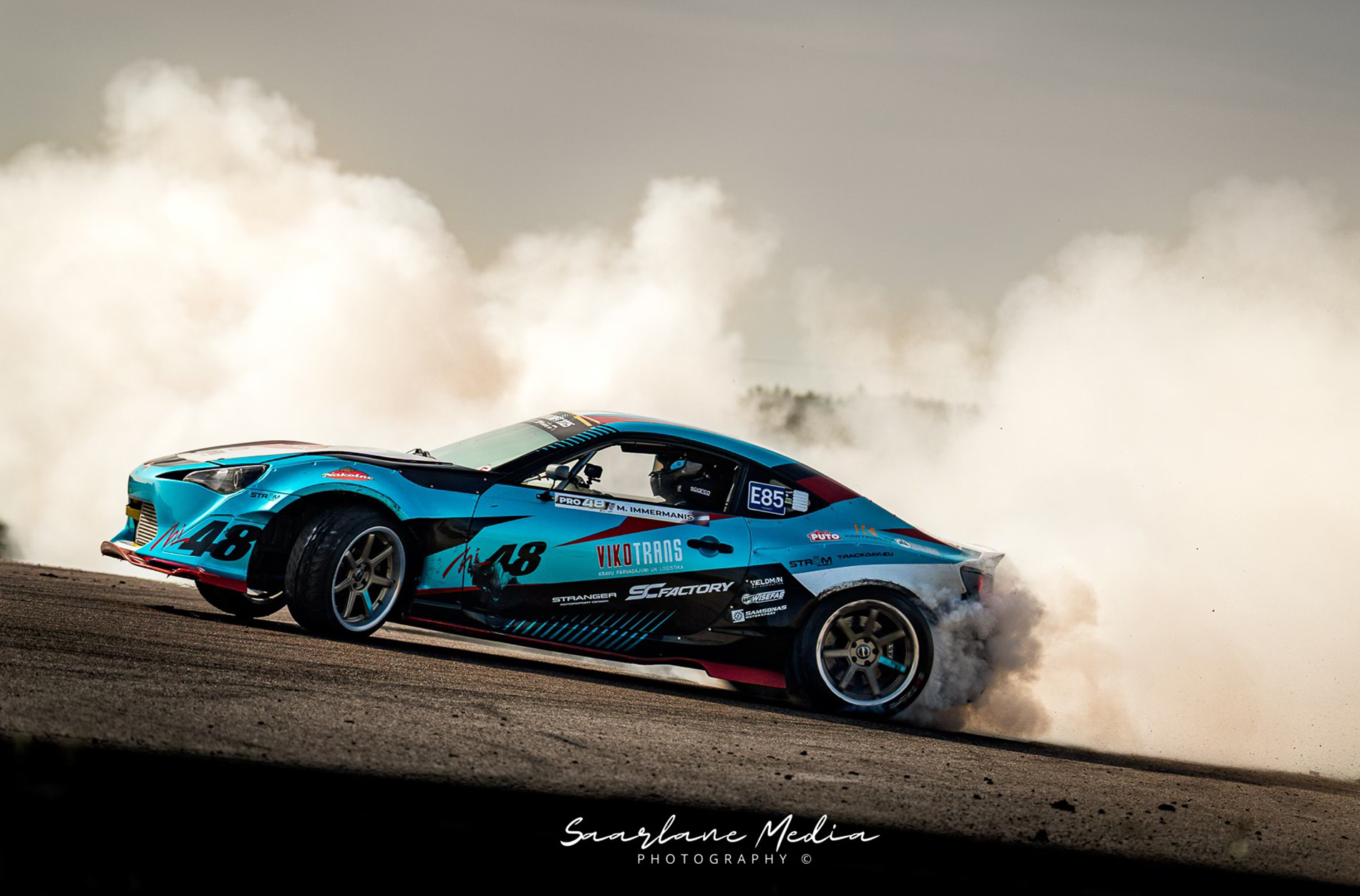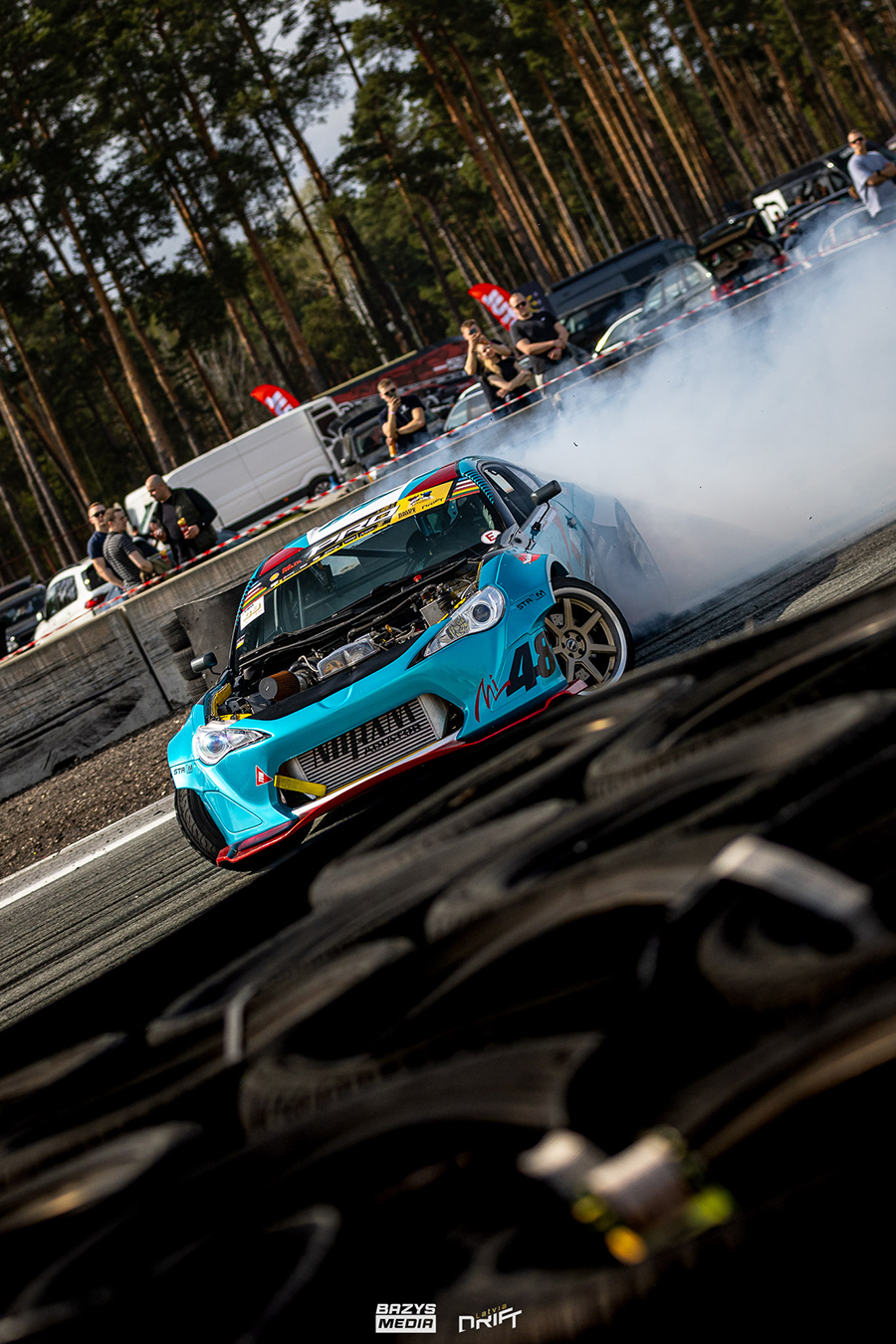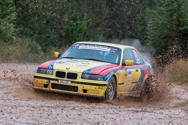 11-05-2022 Riga, Latvia a car that is sitting in the dirt, a drift car is smoking smoke behind it in an obstacle course.