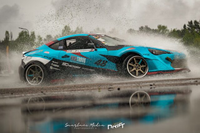 Riga, LATVIA, Bikernieki Raceway - JUN 12, 2021: FIA IDC Intercontinental drifting cup BMW 3 series E46 goes fast at the wet track